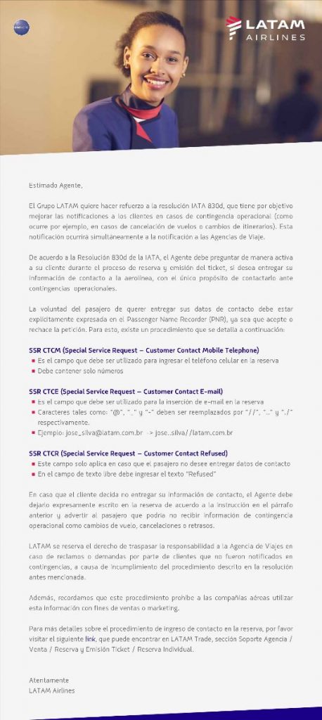 ATAM – RESOLUCION 830D IATA – INGRESO DE CONTACTOS DE PASAJEROS EN RESERVAS Publicado por AVILES WTS Fecha 30 julio, 2019 Compartir: AVILES WTS Noticia anterior UNITED AIRLINES: recordatorio equipaje de Ecuador 30 julio, 2019 Siguiente noticia AIR CANADA: Regulación de Protección a Pasajeros en Canadá y Asignación de asientos 30 julio, 2019 Te puede interesar ACTUALIZACIÓN CONVENIOS TC 19 febrero, 2021 Descarga REQUISITOS IMPORTANTES PARA INGRESAR A EEUU 27 enero, 2021 EASTERN AIRLINES: Ahora ya esta con nosotros – Information GDS 14 agosto, 2020